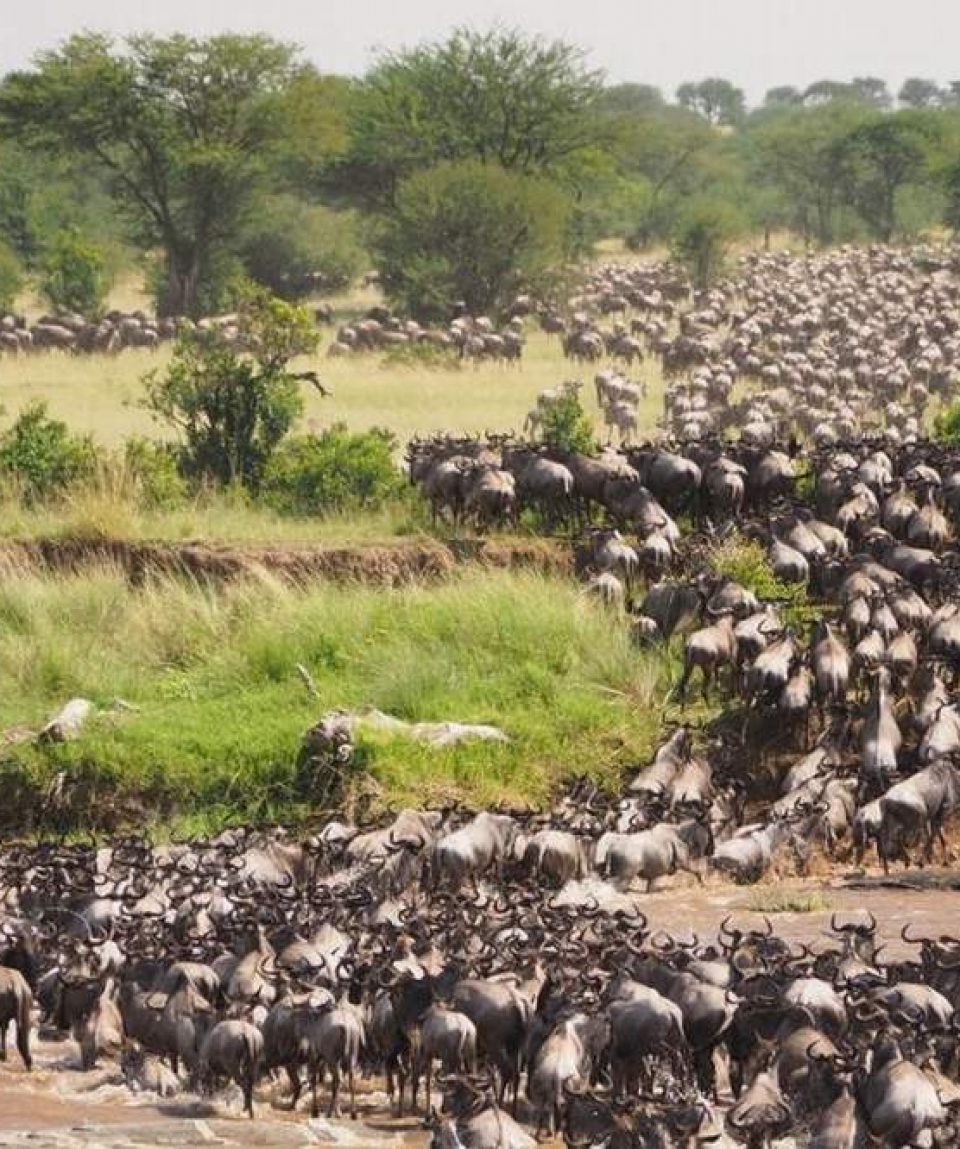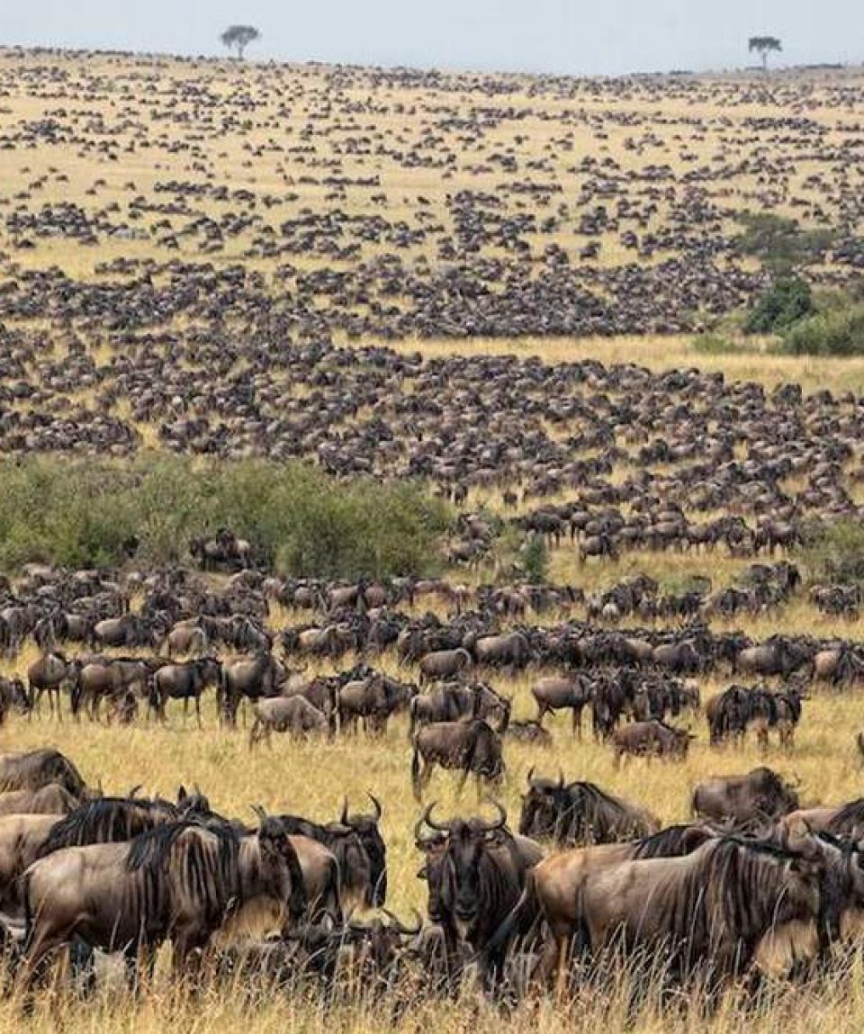 The Great Migration is one of the most spectacular events in the natural world, sometimes referred to as the greatest show on earth. The migration is a movement of 1.5 million wildebeest with 400,000 zebras and 200,000 gazelles accompanying them along the way, making a total of over 2 million migrating from the Maasai Mara into the Serengeti in Tanzania between July and October.