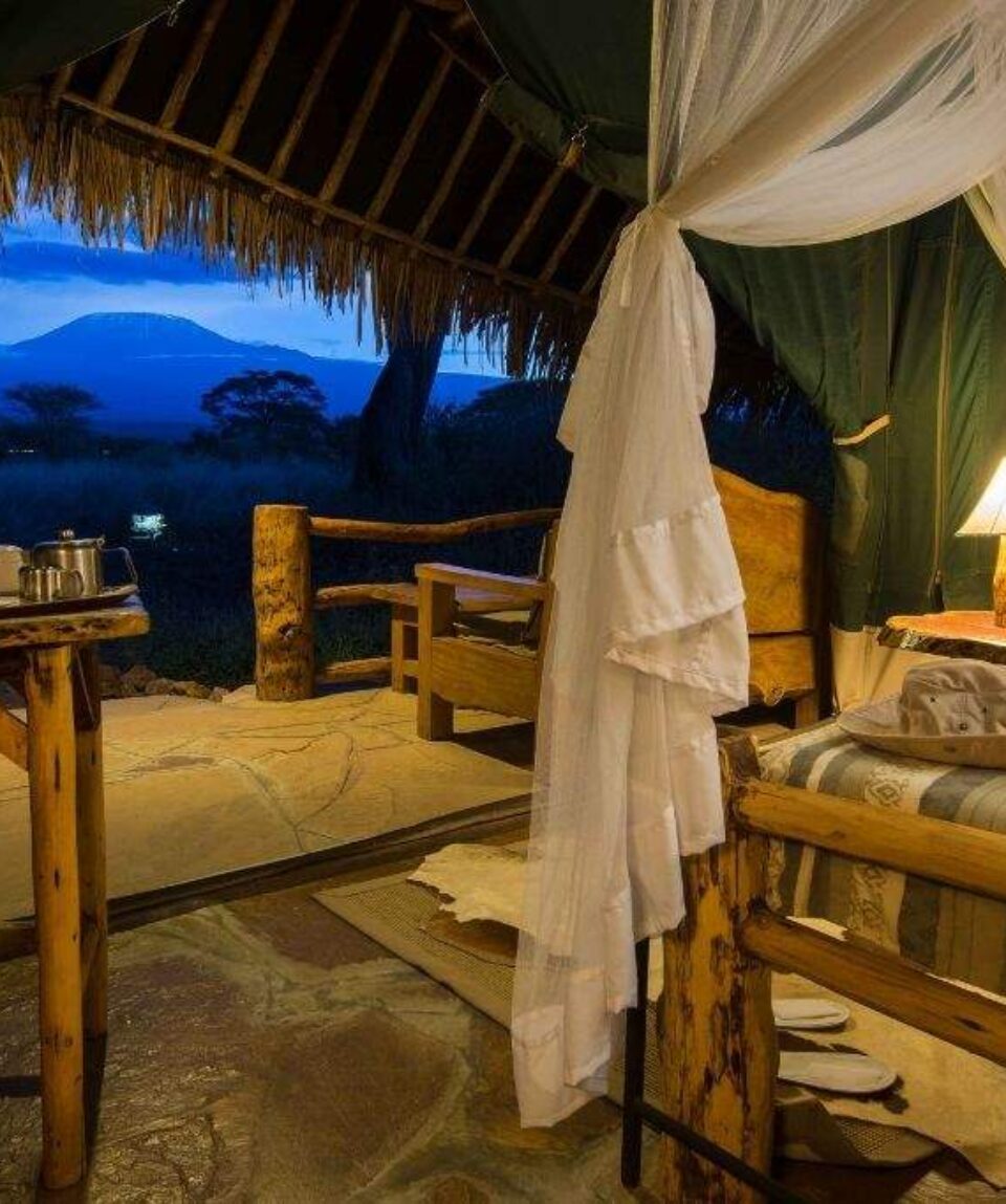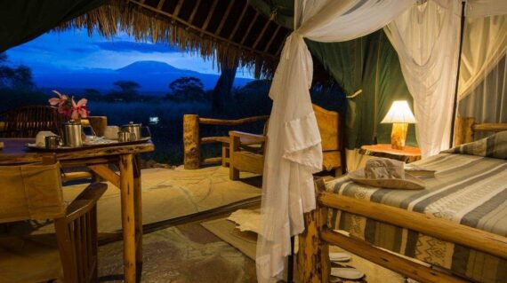 Kibo Safari Camp is a luxury tented camp picturesquely set within the Amboseli National Park Reserve in Kenya overlooking majestic Mt. Kilimanjaro, the highest mountain in Africa. It is less than 2km from the KWS Amboseli National Park Kimana Gate. The Camp is beautifully landscaped, incorporating an open terraced restaurant and bar under acacia trees, with a swimming pool.