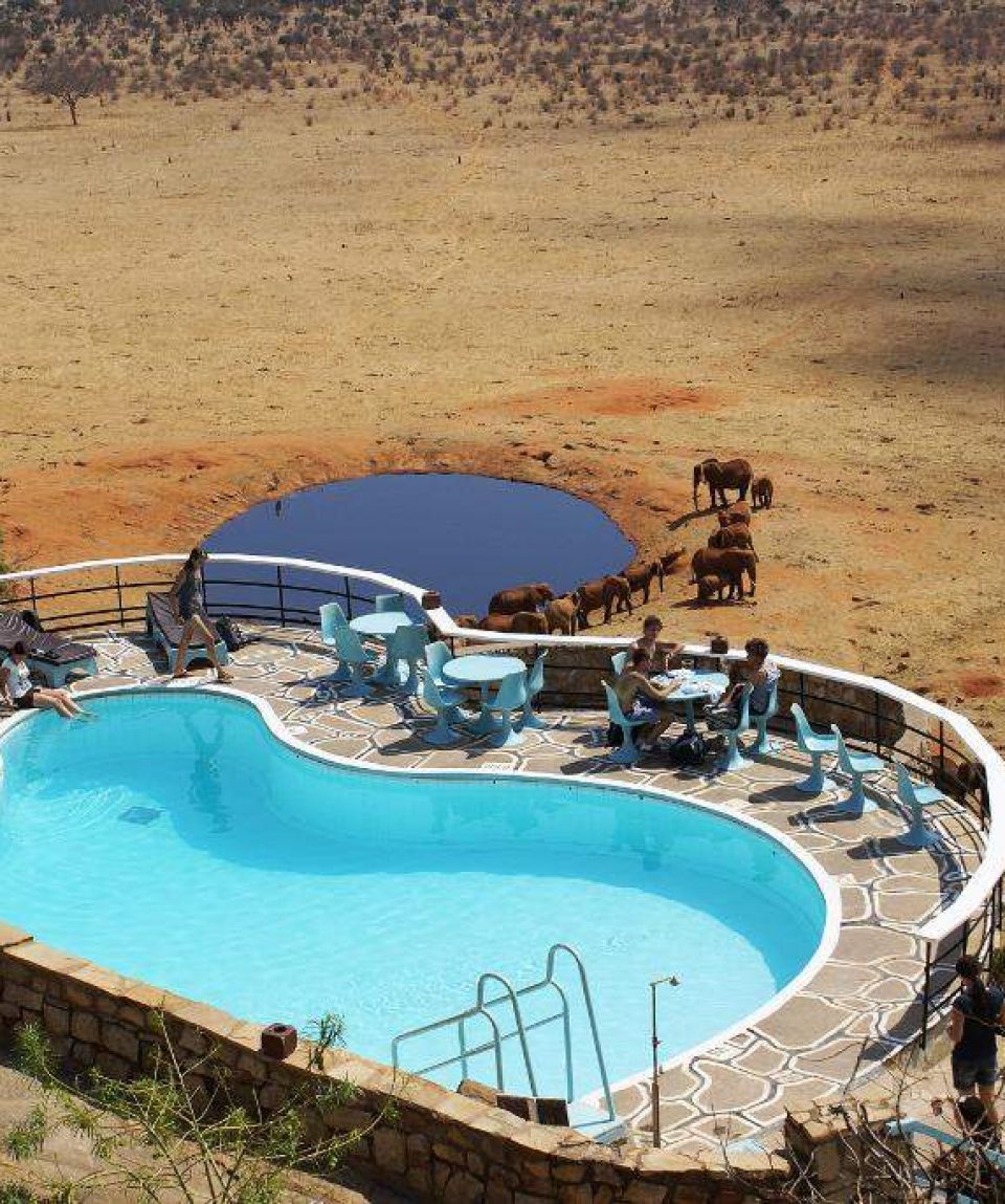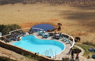 Voi Safari Lodge is a strategically situated safari lodge, in one of the world’s largest game parks – the Tsavo National Park – Voi Safari Lodge stands high above the town of Voi overlooking a vast expanse of the African bush. It is 160km from Mombasa city. You can simply watch the herds of wild animals roam beneath you or you can get closer by a network of access roads reaching into many corners of this 11,666 square kilometre park. From the Lodge, you can look out onto the three water holes and see the ever-changing panorama of Africa unfold right before your eyes and at the same time enjoy the luxury of waiters’ service.